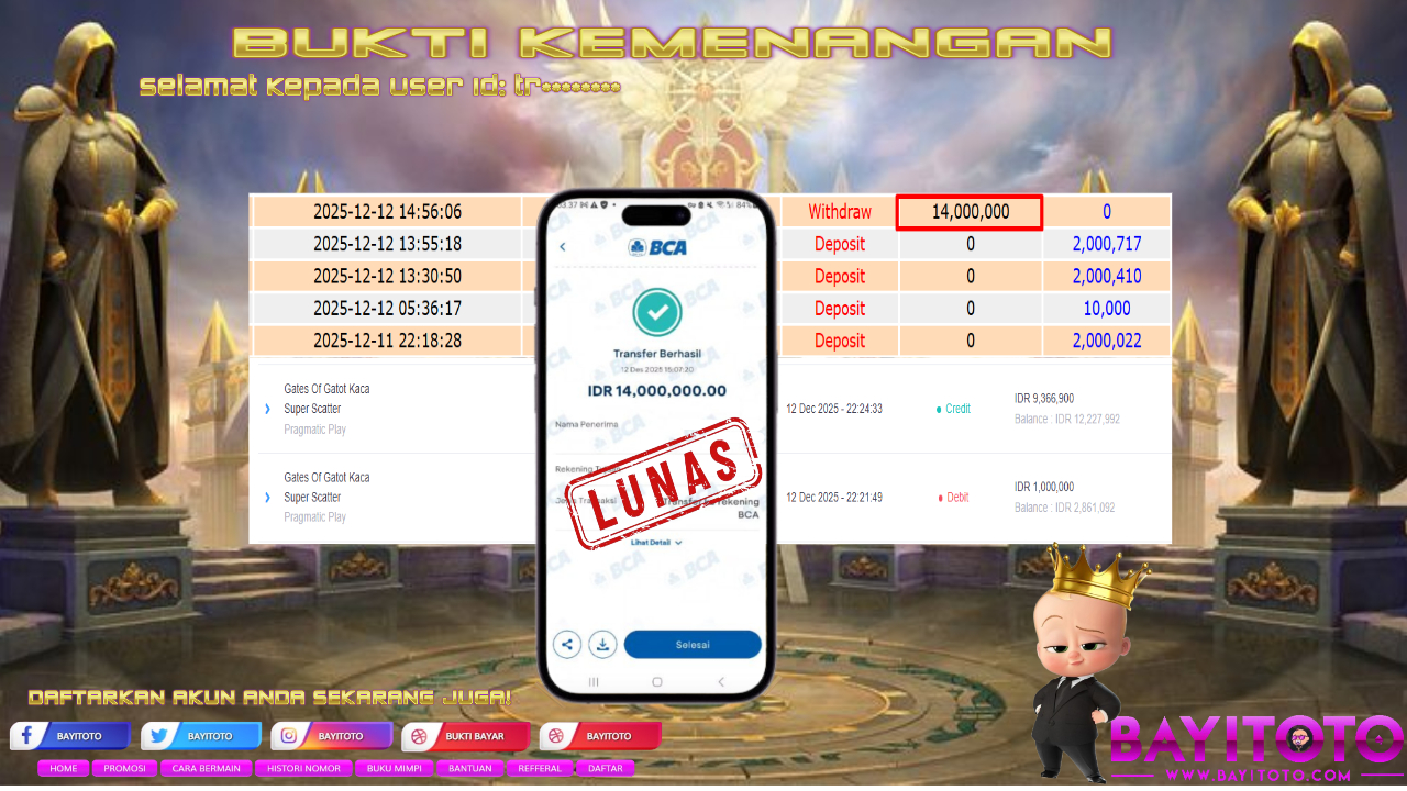 Selamat kepada User id : TR***** Telah berhasil mendapatkan kemenangan besar pad