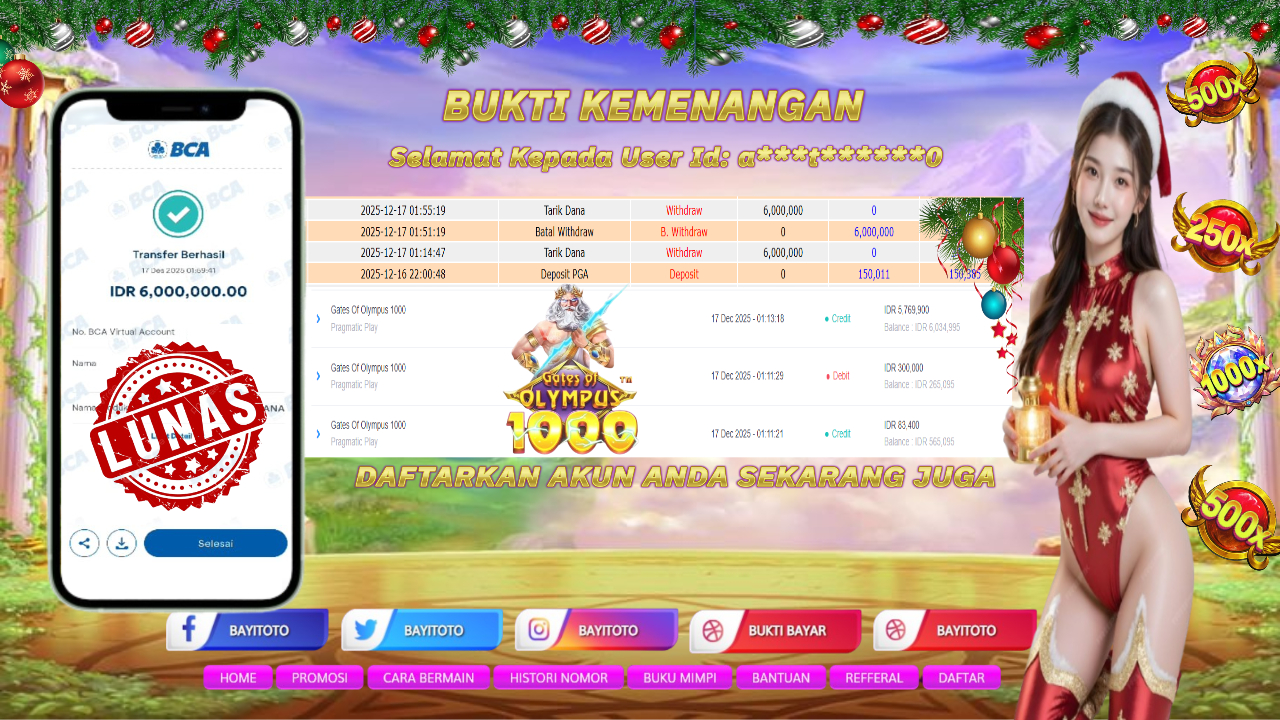 Selamat kepada User id : j***d***k Telah berhasil mendapatkan kemenangan besar